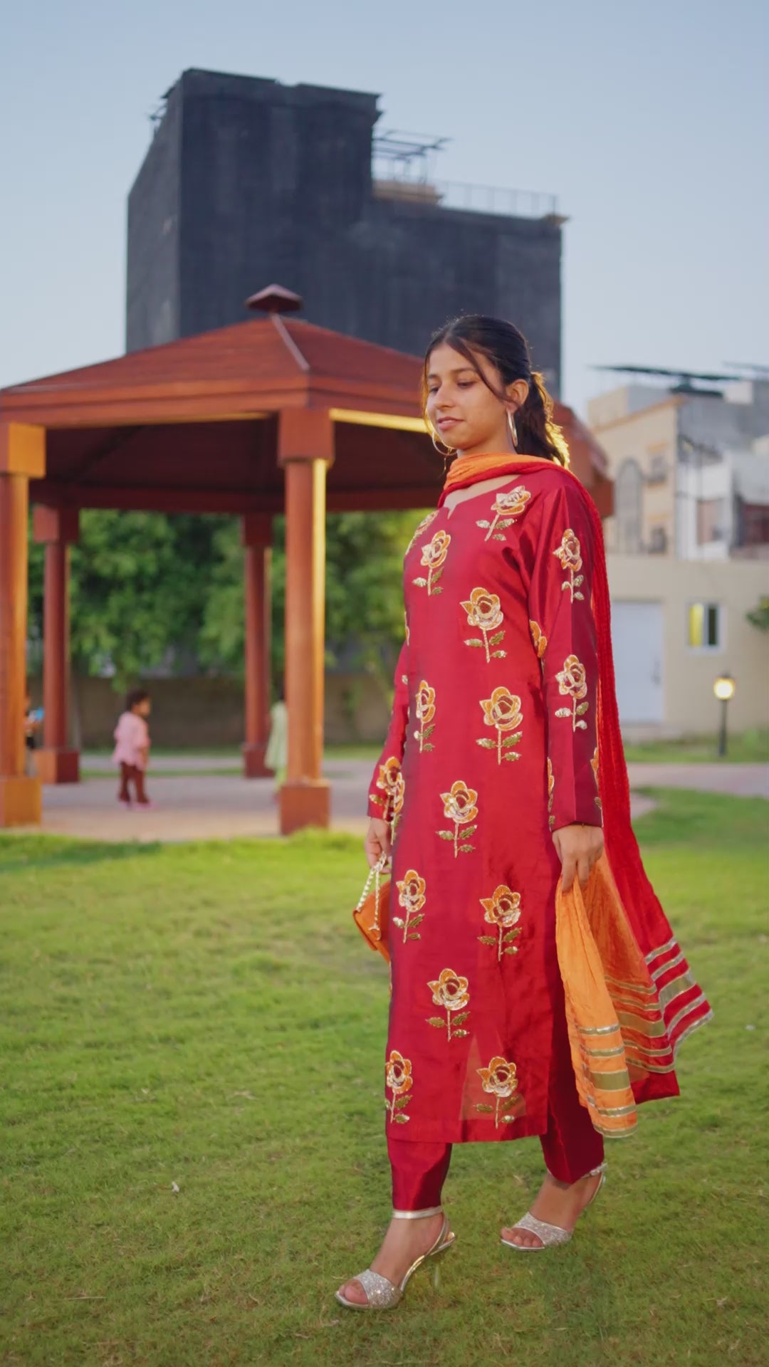 A stunning maroon silk outfit combining rich color, delicate embroidery, and graceful texture for a sophisticated festive look.