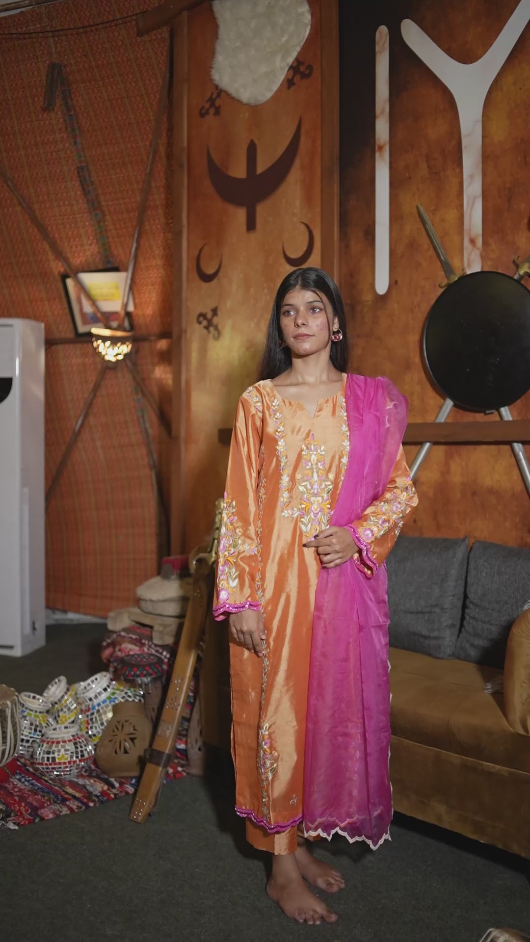 Orange Sheesha Silk 3-Piece Suit with Thread Embroidery and Pink Organza Dupatta